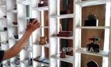 Ibu Ninis (39) membersihkan produk souvernir di Sanggar Punokawan, Desa Wisata Krebet, Pajangan, Bantul, Yogyakarta, Rabu (15/7). Sejak empat bulan lalu hampir tidak ada pesanan, kini Sanggar Punokawan sudah menerima kembali pesanan souvernir. Berbagai macam souvernir acara dan pernikahan tersedia di sini, mulai Rp 10 ribuan hingga ratusan ribu tergantung bentuk dan ukuran. (FOTO : Wihdan Hidayat / Republika)
