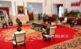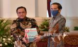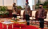 REPUBLIKA.CO.ID, JAKARTA -- Presiden Joko Widodo (kanan) dan Wapres Ma'ruf Amin (kiri)  menerima penyampaian Laporan Hasil Pemeriksaan atas Laporan Keuangan Pemerintah Pusat (LHP LKPP) Tahun 2019, di Istana Negara, Jakarta, Senin (20/7/2020).