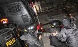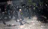 Polisi berusaha membubarkan aksi unjuk rasa di depan kampus Universitas Negeri Makassar (UNM), Makassar, Sulawesi Selatan, Kamis (22/10/2020). Aksi menolak UU Cipta Kerja tersebut berakhir ricuh dan sejumlah kendaraan dibakar serta kantor Parta Nasdem dirusak. ANTARA FOTO/Abriawan Abhe/foc. (FOTO : ANTARA FOTO)