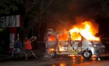 Warga menyiramkan air pada mobil ambulans yang dibakar pengunjuk rasa di depan kampus Universitas Negeri Makassar (UNM), Makassar, Sulawesi Selatan, Kamis (22/10/2020). Aksi menolak UU Cipta Kerja tersebut berakhir ricuh dan sejumlah kendaraan dibakar serta kantor Parta Nasdem dirusak. ANTARA FOTO/Abriawan Abhe/foc. (FOTO : ANTARA FOTO)
