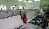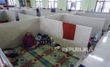 Warga korban banjir beristirahat di bilik pengungsian Aula Kantor Kecamatan Pekalongan Barat, Jawa Tengah, Senin (22/2/2021). Badan Penanggulangan Bencana Daerah (BPBD) Kota Pekalongan memasang bilik sekat bagi pengungsi banjir untuk mengurangi resiko penularan COVID-19. (FOTO : ANTARA/Harviyan Perdana Putra)