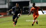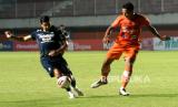 Penyerang Persib Esteban Vizcara mencoba melewati bek Persiraja Budi Santoso pada pertandingan lanjutan Piala Menpora 2021 di Stadion Maguwoharjo, Sleman, Yogyakarta, Jumat (2/4). Persib berhasil mengalahkan Persiraja 2-1. Dengan hasil ini Persib memuncaki grup D, melaju ke babak selanjutnya bersama Bali United. (FOTO : Wihdan Hidayat / Republika)