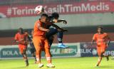 Penyerang Persib Ezra Walian berebut bola dengan bek Persiraja Rahmat Triadi pada pertandingan lanjutan Piala Menpora 2021 di Stadion Maguwoharjo, Sleman, Yogyakarta, Jumat (2/4). Persib berhasil mengalahkan Persiraja 2-1. Dengan hasil ini Persib memuncaki grup D, melaju ke babak selanjutnya bersama Bali United. (FOTO : Wihdan Hidayat / Republika)