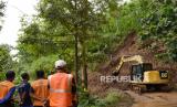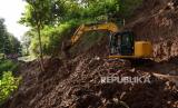 Pekerja menggunakan alat berat membersihkan reruntuhan tanah longsor dari tebing yang menimbun jalan di Desa Ngranget, Dagangan, Kabupaten Madiun, Jawa Timur, Jumat (2/4/2021). Tebing di lembah Gunung Wilis tersebut longsor akibat hujan deras Kamis (1/4) malam. (FOTO : ANTARA/Siswowidodo)