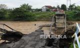 Warga melihat kondisi jembatan yang putus di Sungai Madiun, Kota Madiun, Jawa Timur, Jumat (2/4/2021). Jembatan tersebut putus karena salah satu pilarnya ambruk akibat banjir yang terjadi Kamis (1/4) malam. (FOTO : Antara/Siswowidodo)