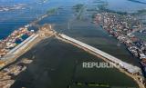 REPUBLIKA.CO.ID, DEMAK -- Foto udara proyek pembangunan Jalan Tol Semarang - Demak seksi II di Kecamatan Sayung, Kabupaten Demak, Jawa Tengah, Selasa (13/4/2021). PT PP - Wika Join Operation selaku kontraktor pelaksana proyek senilai Rp15,3 triliun tersebut menargetkan penyelesaian jalan tol sepanjang 27 kilometer yang akan terintegrasi dengan tanggul laut itu pada Mei 2022 mendatang, hingga hari ini (13/4/2021) progres pembangunannya telah mencapai sekitar 40 persen.