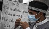 Siswa penyandang disabilitas membaca Alquran menggunakan bahasa isyarat saat kegiatan Pesantren Ramadhan Penyandang Disabilitas di Panti Sosial Rehabilitasi Penyandang Disabilitas Dinsos Jabar, Jalan Jend H Amir Machmud, Kota Cimahi, Kamis (15/4). Pesantren Ramadhan yang diikuti oleh sedikitnya 50 siswa penyandang disabilitas tersebut dalam rangka mengisi waktu luang di bulan Ramadhan dengan memperdalam ilmu agama dengan membaca Alquran, ibadah, dan hafalan doa. Foto: Republika/Abdan Syakura (FOTO : REPUBLIKA/ABDAN SYAKURA)