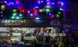 Warga menjaga warungnya di dekat hiasan bertemakan Ramadhan di Kampung Martakura, Kebon Melati, Jakarta, Kamis (15/4). Kampung Martakura dihias secara swadaya oleh warga dengan ornamen bertemakan Ramadhan untuk menyambut bulan suci Ramadhan dan memberikan kegiatan positif kepada warga di masa pandemi Covid-19. Republika/Putra M. Akbar (FOTO : Republika/Putra M. Akbar)