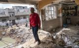 Nader al-Masri, pelari jarak jauh yang berpartisipasi dalam lusinan kompetisi internasional, termasuk Olimpiade 2008, berdiri di dalam rumahnya yang rusak parah di samping kawah tempat rumah Ramez al-Masri dihancurkan oleh serangan udara Israel di Beit Hanoun, Jalur Gaza utara, Ahad (23/5) waktu setempat. (FOTO : AP / John Minchillo)