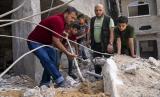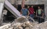 Ramez al-Masri (kiri) menggunakan sekop untuk menggali di bawah balok beton di samping kawah di mana rumahnya yang hancur oleh serangan udara Israel di Beit Hanoun, Jalur Gaza utara, Ahad (23/5) waktu setempat. (FOTO : AP / John Minchillo)