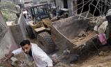 Sebuah buldoser digunakan untuk membersihkan jalan dari puing-puing di samping kawah tempat rumah Ramez al-Masri yang hancur oleh serangan udara Israel di Beit Hanoun, Jalur Gaza utara, Ahad (23/5) waktu setempat. (FOTO : AP / John Minchillo)