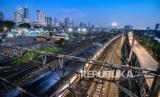 REPUBLIKA.CO.ID, JAKARTA -- Kereta Rel Listrik (KRL) melintas dengan latar belakang gedung bertingkat di Jakarta, Rabu (26/5/2021). Kemenkeu menyampaikan bahwa defisit APBN hingga April 2021 mencapai Rp138,1 triliun.  Angka ini setara dengan0,83 persen dari PDB dari target defisit sebesar 5,7 persen tahun ini.