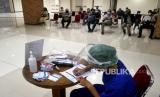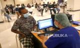 Tenaga kesehatan melayani pendaftaran warga untuk vaksinasi Covid-19 warga pralansia di RS Siloam Yogyakarta, Senin (7/6). Pemerintah Yogyakarta mulai melakukan vaksinasi Covid-19 untuk warga pralansia atau usia 50 hingga 60 tahun. Hal ini untuk menggenjot capaian vaksinasi Covid-19 warga rentan terhadap virus Covid-19. (FOTO : Wihdan Hidayat / Republika)