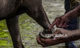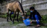 Seorang kusir delman memberi makan kudanya saat acara workshop perawatan dan pemasangan tapal kuda di Agro Edukasi Wisata Ragunan, Jakarta, Senin (14/6). Jakarta Animal Aid Network bersama Suku Dinas Ketahanan Pangan, Kelautan dan Pertanian Jakarta Selatan menyelenggarakan acara tersebut untuk mengedukasi kesejahteraan kuda pekerja kepada kusir. Republika/Putra M. Akbar (FOTO : Republika/Putra M. Akbar)