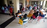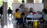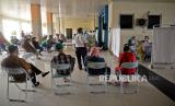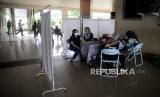 Sejumlah warga rumah susun (rusun) Jatinegara Barat menunggu giliran untuk disuntik vaksin Covid-19 di Jakarta, Jumat (18/6). Kegiatan vaksinasi dengan kuota 250 orang tersebut diharapkan dapat memenuhi target herd immunity atau atau kekebalan kelompok di DKI Jakarta pada Agustus tahun ini.Prayogi/Republika. (FOTO : Prayogi/Republika.)