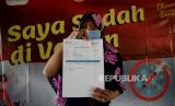 Seorang warga rumah susun (rusun) Jatinegara Barat menunjukan kartu vaksinasi usai disuntik Vaksin Covid-19 di Jakarta, Jumat (18/6). Kegiatan vaksinasi dengan kuota 250 orang tersebut diharapkan dapat memenuhi target herd immunity atau kekebalan kelompok di DKI Jakarta pada Agustus tahun ini.Prayogi/Republika. (FOTO : Prayogi/Republika.)
