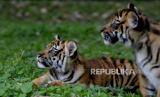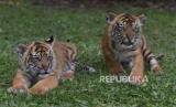 Dua bayi Harimau Sumatera (Panthera tigris sumatrae) bermain di halaman saat pemberian nama bayi tersebut pada peringatan Hari Harimau Sedunia di Taman Safari Prigen, Pasuruan, Jawa Timur, Kamis (29/7/2021). Dua bayi Harimau Sumatera yang lahir pada 4 Mei 2021 dan berjenis kelamin betina itu diberi nama Isyana dan Aura, dan menambah koleksi Harimau Sumatera di Taman Safari Prigen menjadi empat ekor. (FOTO : ANTARA/Zabur Karuru/rwa.)