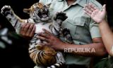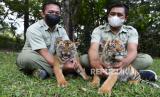 REPUBLIKA.CO.ID, PRIGEN -- Perawat satwa menggendong dua bayi Harimau Sumatera (Panthera tigris sumatrae) saat pemberian nama bayi tersebut pada peringatan Hari Harimau Sedunia di Taman Safari Prigen, Pasuruan, Jawa Timur, Kamis (29/7/2021). Dua bayi Harimau Sumatera yang lahir pada 4 Mei 2021 dan berjenis kelamin betina itu diberi nama Isyana dan Aura, dan menambah koleksi Harimau Sumatera di Taman Safari Prigen menjadi empat ekor.