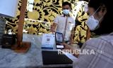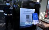 REPUBLIKA.CO.ID, BADUNG -- Pengunjung membuka aplikasi PeduliLindungi untuk memindai QR Code saat mengunjungi pusat perbelanjaan Bali Collection di The Nusa Dua, Badung, Bali, Jumat (30/7).