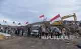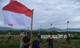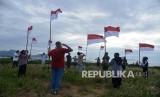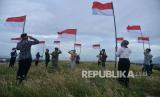 REPUBLIKA.CO.ID,BANDA ACEH -- Sejumlah jurnalis dari berbagai media yang tergabung dalam Komunitas Pena Emas Aceh bersama TNI memberikan penghormatan saat pengibaran bendera di Bukit Pengolahan Sampah kawasan pesisir pantai, Kampung Jawa, Banda Aceh, Senin (16/8/2021).