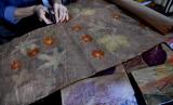 Pekerja memotong kantong semen bekas yang telah diberi motif untuk dibuat tas di UMKM HeyStartic di Surabaya, Jawa Timur, Jumat (27/8/2021). UMKM binaan BRI tersebut memproduksi berbagai aksesori berbahan dasar kantong semen bekas seperti tas, dompet, sepatu, dan berbagai aksesori lainnya yang dijual berkisar Rp50 ribu-Rp350 ribu per buah. (FOTO : ANTARA/Zabur Karuru)