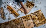 Perajin menyelesaikan produksi kerajinan jam dinding dari limbah kayu di Kampung Sentral, Lebak, Banten, Ahad (5/9/2021). Produksi kerajinan berbagai macam bentuk seperti miniatur kereta, jam dinding, dan miniatur rumah tersebut dibuat dengan memanfaatkan limbah kayu dan bambu yang dijualnya seharga Rp25 ribu hingga Rp150 ribu per unit. (FOTO : ANTARA/Muhammad Bagus Khoirunas/rwa.)