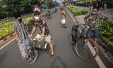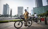 Anggota Komunitas Onthel Batavia berbaju batik saat bersepeda di kawasan Bundaran HI, Jakarta, Sabtu (2/10/2021). Kegiatan berbaju batik saat bersepeda itu sebagai bentuk perayaan memperingati Hari Batik Nasional setiap tanggal 2 Oktober. (FOTO : ANTARA/Aprillio Akbar)