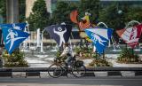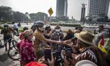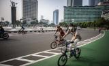 Pesepeda berbaju batik melintas di kawasan Bundaran HI, Jakarta, Sabtu (2/10/2021). Kegiatan berbaju batik saat bersepeda itu sebagai bentuk perayaan memperingati Hari Batik Nasional setiap tanggal 2 Oktober. (FOTO : ANTARA/Aprillio Akbar)