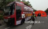 REPUBLIKA.CO.ID, SURABAYA -- Polisi berjalan di dekat Bus Keliling Vaksinasi Merdeka yang disiagakan di Bundaran Waru, Surabaya, Jawa Timur, Rabu (6/10/2021). Polrestabes Surabaya menyediakan dua armada bus keliling Vaksinasi Merdeka di perbatasan Kota Surabaya untuk memfasilitasi warga yang belum tervaksin sebagai upaya mendukung percepatan program vaksinasi COVID-19.