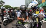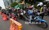 Polisi menanyakan status tervaksinasi COVID-19 kepada pengendara motor di Bundaran Waru, Surabaya, Jawa Timur, Rabu (6/10/2021). Polrestabes Surabaya menyiagakan dua bus keliling Vaksinasi Merdeka di perbatasan Kota Surabaya untuk memfasilitasi warga yang belum tervaksin sebagai upaya mendukung percepatan program vaksinasi COVID-19. (FOTO : Antara/Didik Suhartono)