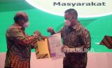 Direktur PT Adaro Indonesia Priyadi (kanan) memberikan nota serah terima kepada Plt Dirjen Pengendalian Daerah Aliran Sungai dan Rehabilitasi Hutan (PDASRH) KLHK Helmi Basalamah (kiri) pada acara Ekspose hasil penilaian dan serah terima hasil penanaman dalam rangka rehabilitasi DAS dan pelaksanaan penanaman reboisasi pada lahan kompensasi oleh pemegang Izin Pinjam Pakai Kawasan Hutan IPPKH atau Pinjam Pakai Kawasan Hutan (PPKH) di Gedung Manggala Wanabakti, Jakarta, Selasa (12/10). Kegiatan tersebut sebagai upaya perbaikan lingkungan dan meminimalisir kerusakan ekosistem hutan.Prayogi/Republika. (FOTO : Prayogi/Republika.)