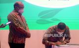 REPUBLIKA.CO.ID, JAKARTA -- Direktur PT Adaro Indonesia Priyadi menandatangani nota serah terima disaksikan Plt Dirjen Pengendalian Daerah Aliran Sungai dan Rehabilitasi Hutan (PDASRH) KLHK Helmi Basalamah di Gedung Manggala Wanabakti, Jakarta, Selasa (12/10).