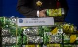 Petugas merapikan barang bukti narkotika di Jakarta, Selasa (19/10). BNN memusnahkan 465 kilogram sabu, 113 kilogram ganja dan 1 kilogram MDMB-4en-Pinaca hasil dari pengungkapan sepuluh kasus yang berbeda. (FOTO : Republika/Putra M. Akbar)