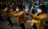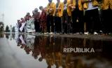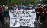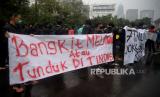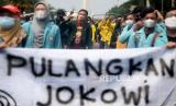 Sejumlah mahasiswa melakukan aksi unjuk rasa di Kawasan Patung Kuda, Jakarta, Kamis (21/10).Aksi mahasiswa ini dilakukan sebagai bentuk penyampaian aspirasi dan kritik atas kinerja 2 tahun kepemimpinan Joko Widodo dan Maruf Amin. (FOTO : Prayogi/Republika.)