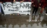 Sejumlah mahasiswa melakukan aksi unjuk rasa di Kawasan Patung Kuda, Jakarta, Kamis (21/10).Aksi mahasiswa ini dilakukan sebagai bentuk penyampaian aspirasi dan kritik atas kinerja 2 tahun kepemimpinan Joko Widodo danruf Amin. Ma (FOTO : Prayogi/Republika.)