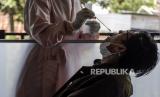 Petugas kesehatan memeriksa sampel lendir calon penumpang saat tes usap PCR di Bandara Husein Sastranegara, Kota Bandung, Selasa (26/10). Pemerintah berencana menjadikan tes PCR syarat wajib perjalanan untuk pengguna semua moda transportasi guna mencegah lonjakan kasus Covid-19 jelang libur Natal dan tahun baru (Nataru). Foto: Republika/Abdan Syakura (FOTO : REPUBLIKA/ABDAN SYAKURA)