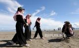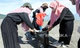 REPUBLIKA.CO.ID, ACEH BESAR -- Pemuda dan pemudi (kiri) yang tergabung dalam gerakan aksi baik yang difasilitasi yayasan Econusa dan penjaga laut membersihkan sampah di pantai Desa Lam Teungoh, Kecamatan Peukan Bada, Aceh Besar, Aceh, Kamis (28/10/2021).