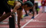 Pelari Riau Edy Siswanto bersiap di garis start pada babak final lari 100 meter putra klasifikasi T46 dan T47 Peparnas Papua di Stadion Lukas Enembe, Kabupaten Jayapura, Papua, Rabu (10/11/2021). (FOTO : ANTARA/Raisan Al Farisi)