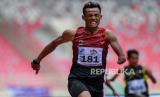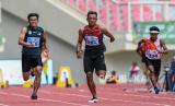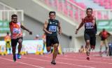 REPUBLIKA.CO.ID,JAYAPURA -- Pelari Jawa Tengah Rizal Bagus Saktyono (tengah) berpacu kecepatan dengan pelari lainnya pada babak final lari 100 meter putra klasifikasi T46 dan T47 Peparnas Papua di Stadion Lukas Enembe, Kabupaten Jayapura, Papua, Rabu (10/11/2021).