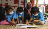 REPUBLIKA.CO.ID,JAKARTA -- Relawan mengajarkan sejumlah anak membaca dongeng di Bale Buku, Cakung, Jakarta, Sabtu (20/11/2021).
