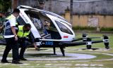 Petugas melakukan pemeriksaan taksi terbang EHang 216 sebelum menjalani demo flight di kawasan Klungkung, Bali, Jumat (26/11/2021).Kendaraan udara otonom bertenaga listrik dengan kapasitas dua orang penumpang itu direncanakan akan dapat mengangkut penumpang di area perkotaan dengan memanfaatkan jaringan internet dan dikendalikan dari darat.  (FOTO : ANTARA/Fikri Yusuf)