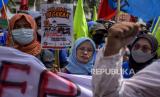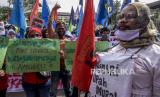 Sejumlah buruh dari berbagai serikat buruh berunjuk rasa di depan Gedung Sate, Jalan Diponegoro, Kota Bandung, Senin (29/11). Dalam unjuk rasa tersebut, mereka menolak penetapan Upah Minimum Kabupaten/Kota (UMK) berdasarkan Peraturan Pemerintah (PP) Nomor 36 Tahun 2021 tentang Pengupahan dan mendesak agar Gubernur Jawa Barat Ridwan Kamil menetapkan UMK sesuai rekomendasi bupati/wali kota se-Jawa Barat. (FOTO : REPUBLIKA/ABDAN SYAKURA)