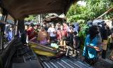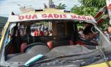 REPUBLIKA.CO.ID,Warga melihat kondisi Angkutan Kota (angkot) yang tertabrak kereta api di kawasan Jalan Sekip, Medan, Sumatera Utara, Sabtu (4/12/2021).