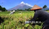 REPUBLIKA.CO.ID, LUMAJANG -- Petani memanen padinya dengan latar belakang Gunung Semeru di Desa Sumber Mujur, Candipuro, Lumajang, Jawa Timur, Sabtu (11/12/2021). Petani mengaku tetap memanen padi karena menjadi sumber pendapatannya meski takut dengan kondisi Gunung Semeru yang masih fluktuatif dengan status Waspada.