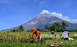 Petani memanen padinya dengan latar belakang Gunung Semeru di Desa Sumber Mujur, Candipuro, Lumajang, Jawa Timur, Sabtu (11/12/2021). Petani mengaku tetap memanen padi karena menjadi sumber pendapatannya meski takut dengan kondisi Gunung Semeru yang masih fluktuatif dengan status Waspada. (FOTO : Antara/Budi Candra Setya)