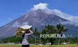 Petani mengangkut hasil panen padi dengan latar belakang Gunung Semeru di Desa Sumber Mujur, Candipuro, Lumajang, Jawa Timur, Sabtu (11/12/2021). Petani mengaku tetap memanen padi karena menjadi sumber pendapatannya meski takut dengan kondisi Gunung Semeru yang masih fluktuatif dengan status Waspada. (FOTO : Antara/Budi Candra Setya)