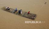 REPUBLIKA.CO.ID, Sejumlah warga menggunakan jasa rakit bambu untuk melintasi sungai Krueng Meureubo yang menghubungkan Desa Meunuang Kinco dengan Desa Alue Keumang Kecamatan Pante Ceureumen, Aceh Barat, Aceh, Sabtu (11/12/2021).