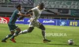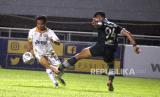 Pesepak bola PSMS Medan M Shabilah (kanan) mencoba merebut bola dari pesepak bola Martapura Dewa United Rangga (kiri) dalam lanjutan Liga 2 babak 8 besar di Stadion Pakansari, Kabupaten Bogor, Jawa Barat, Kamis (23/12/2021). ANTARA FOTO/Yulius Satria Wijaya/hp. (FOTO : ANTARA FOTO/YULIUS SATRIA WIJAYA)