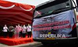 Menteri Perhubungan Budi Karya Sumadi (tengah) didampingi Dirut PT INKA (Persero) Budi Noviantoro (kanan) dan Komisaris Independen PT INKA Siti Malkhamah (kedua kanan) menekan tombol saat melepas secara resmi gerbong barang produksi di PT INKA ke New Zealand di Madiun, Jawa Timur, Jumat (31/12/2021). INKA Group mengekspor 262 gerbong barang jenis container flat top wagon ke Kiwi Rail New Zealand yang merupakan badan usaha milik negara New Zealand. (FOTO : Antara/Siswowidodo)