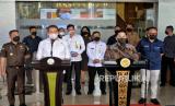 Menteri BUMN Erick Thohir (kedua kanan) bersama Jaksa Agung ST Burhanuddin (kedua kiri) memberikan keterangan pers di Gedung Kartika Adhyaksa Kejaksaan Agung Republik Indonesia, Jakarta, Selsa (11/1). Kedatangan Menteri BUMN ke Kejaksaan Agung tersebut dalam rangka melaporkan beberapa kasus terkait maskapai Garuda Indonesia. Republika/Thoudy Badai (FOTO : Republika/Thoudy Badai)